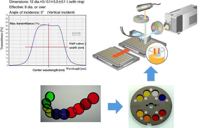 A band-pass filter transmits only a specific wavelength range in the spectrum of light, and consists of non-absorbable dielectric films by making use of the principle of the Fabry-Perot interferometer. Band-pass filters are used for medical equipment, including analyzers to examine immune responses and blood testing equipment.