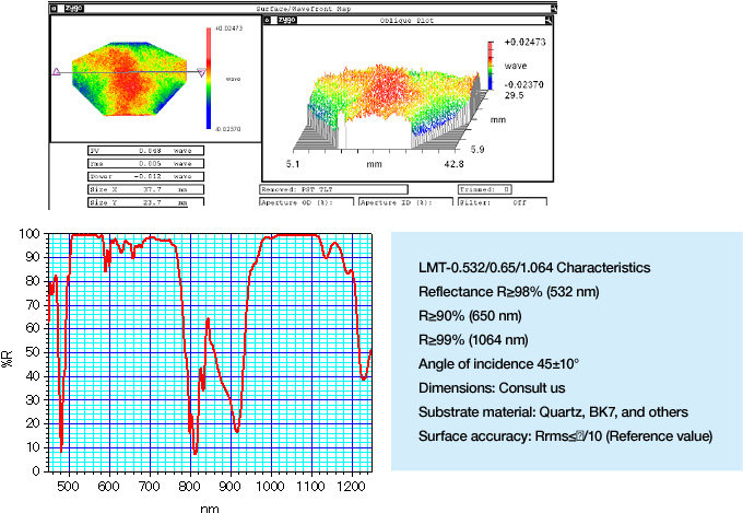 Our high-power lasers incorporate not only high-reflection specifications but also custom-made specifications, including half-mirror specifications. Furthermore, customers can specify the materials and shapes of substrates to meet particular laser wavelength and application requirements.